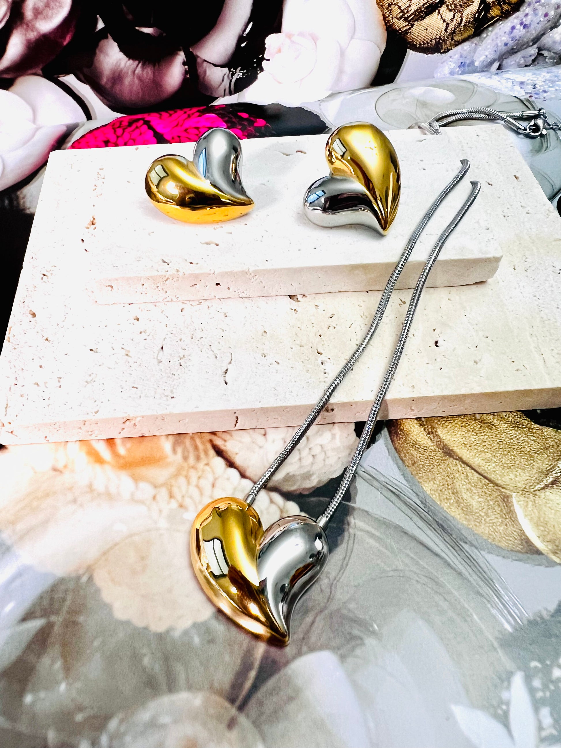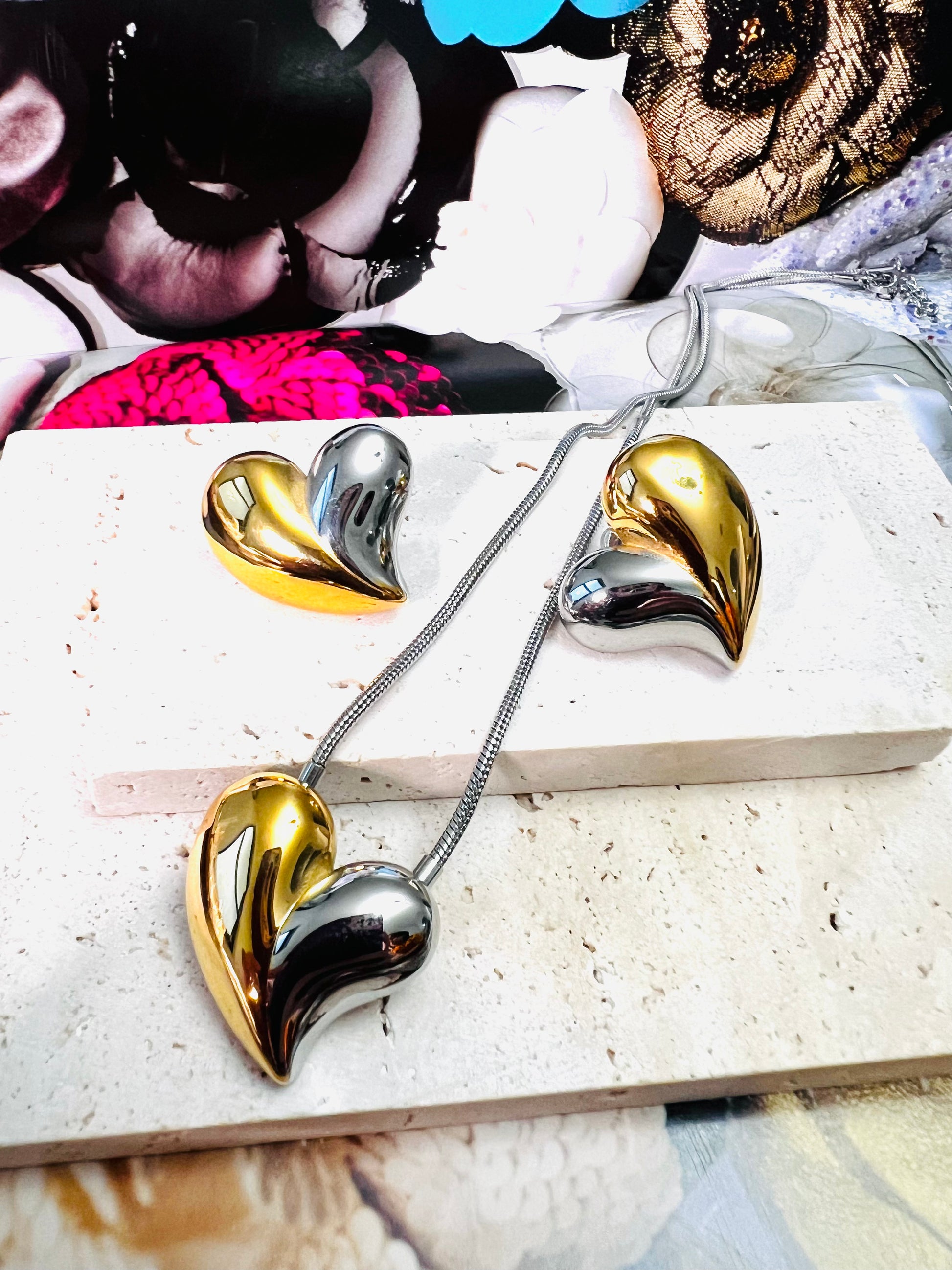 Complete jewelry set including necklace and earrings with a bicolor heart design. Made of stainless steel with 18K gold plating. Hypoallergenic, waterproof, and resistant to tarnish. A timeless and stylish gift option or a perfect addition to your daily looks.